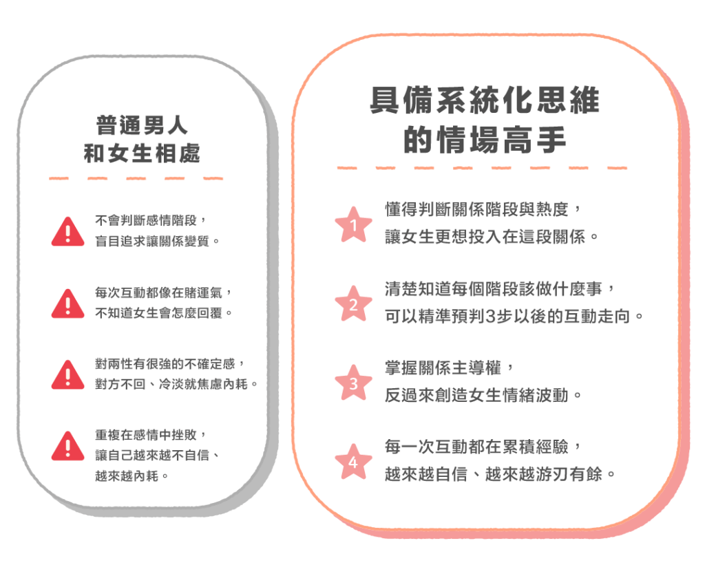 有系統才能清楚每個階段該做、不該做的事, 讓你在感情中像是看著攻略打遊戲一樣輕鬆自在。